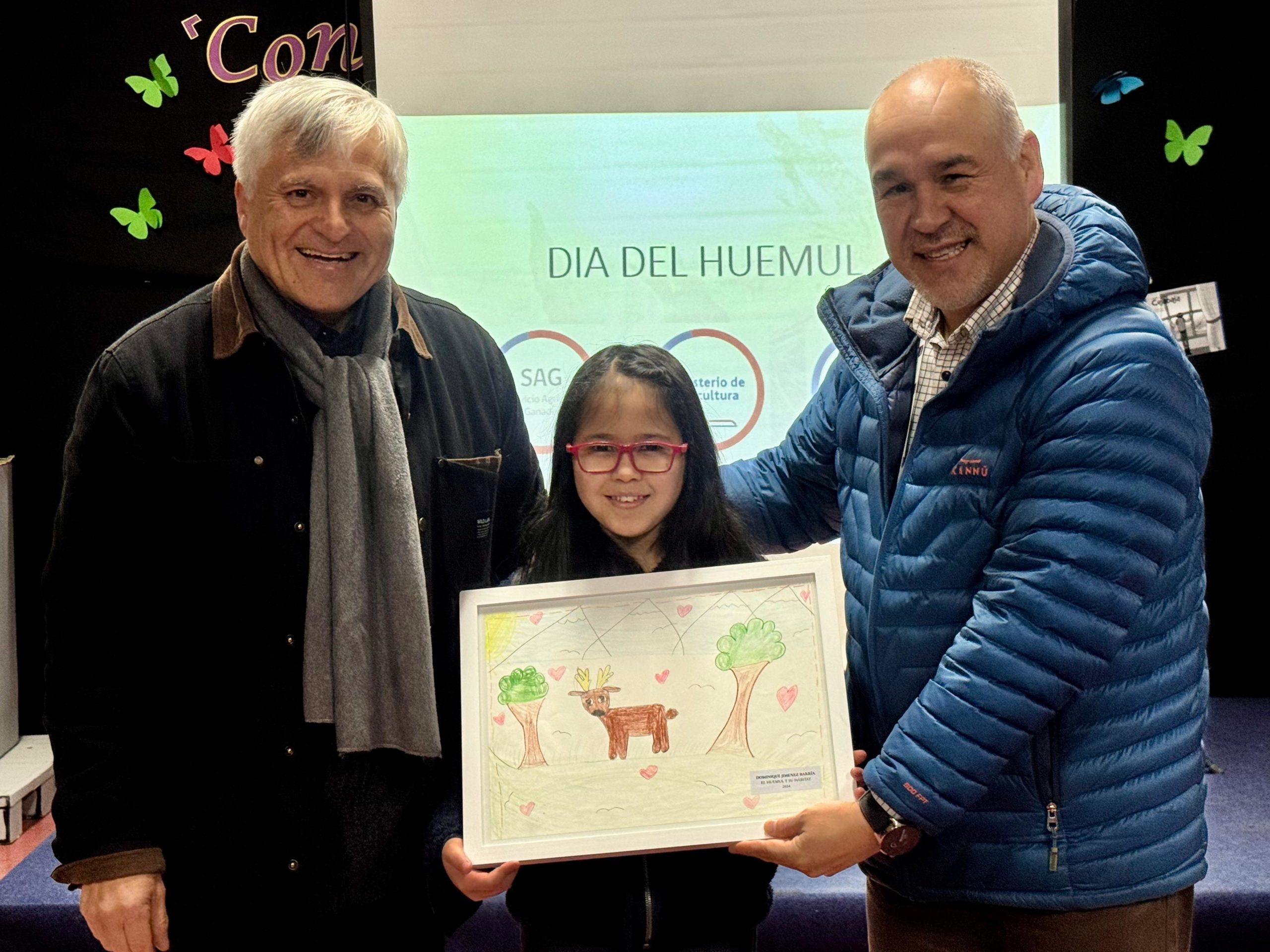 La oportunidad permitió reconocer a la estudiante que participó del concurso de dibujo “Entre todas y todos cuidamos al huemul 2024”, Dominique Jiménez Barría, para hacer entrega del ejemplar original con el que participó en el certamen. Por otro lado, el seremi obsequió al establecimiento publicaciones del Ministerio de Agricultura que buscan fomentar el discernimiento a la especie huemul, y la lectura en relación con historias que nacen desde los territorios rurales de Chile.